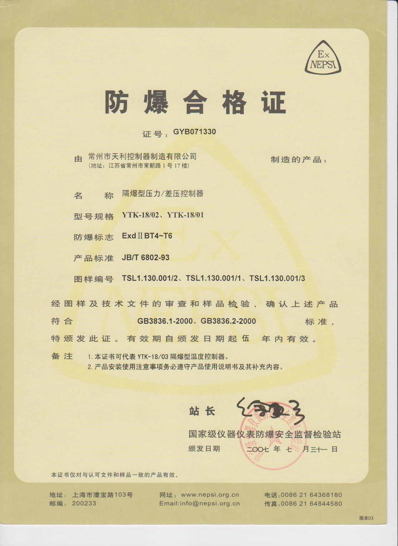 天利控制器天祥牌防爆壓力控制器各類資質(zhì)證書:
