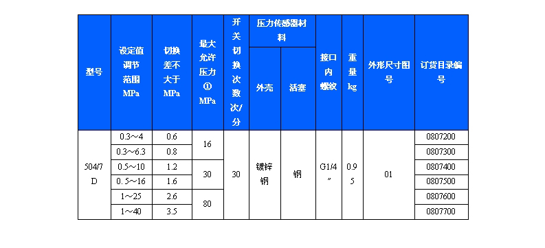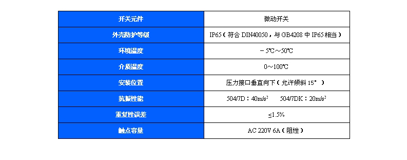504/7D防爆壓力控制器采用帶泄油口的活塞式傳感器,可用于中性液壓油等介質。504/7D防爆壓力控制器的設定值可調,調節范圍0.3~40MPa。